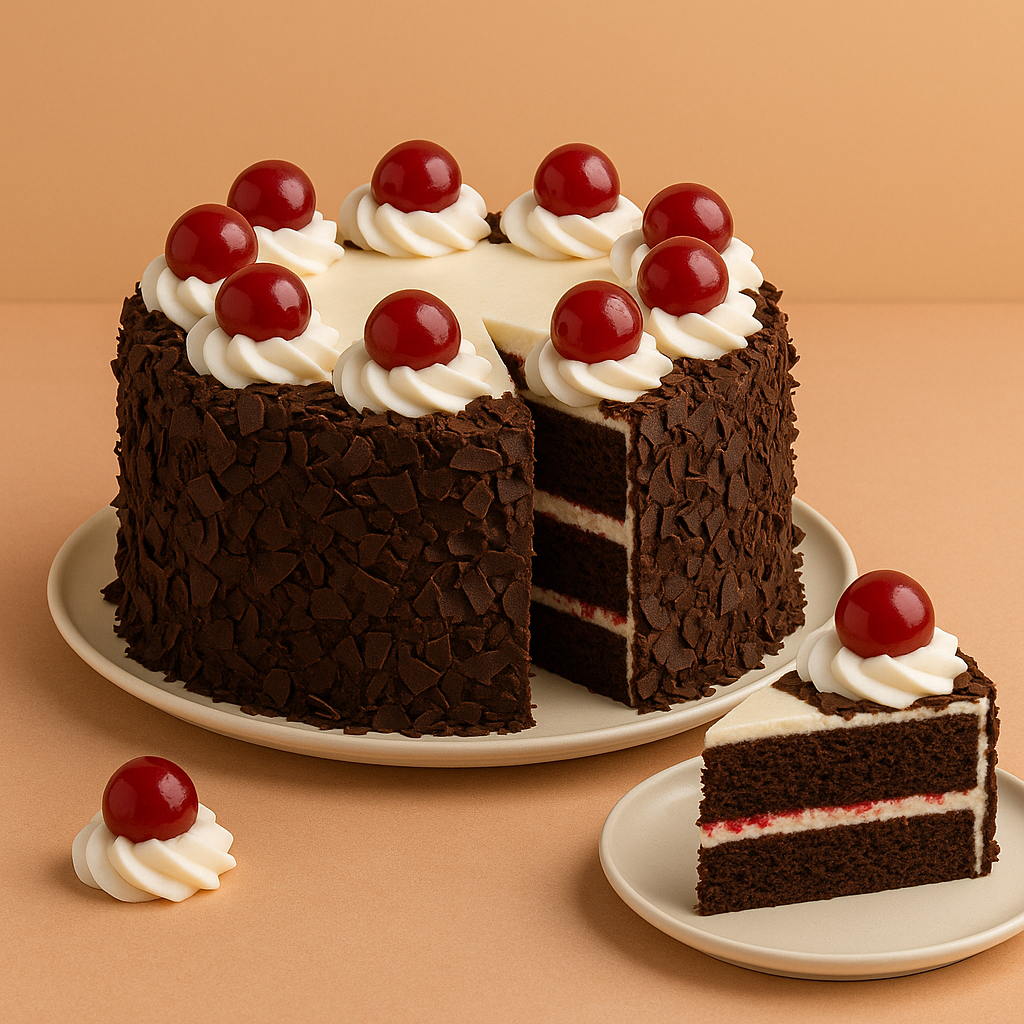 Classic indulgence with layers of rich chocolate sponge, whipped cream, and cherries. A timeless favorite for every celebration.