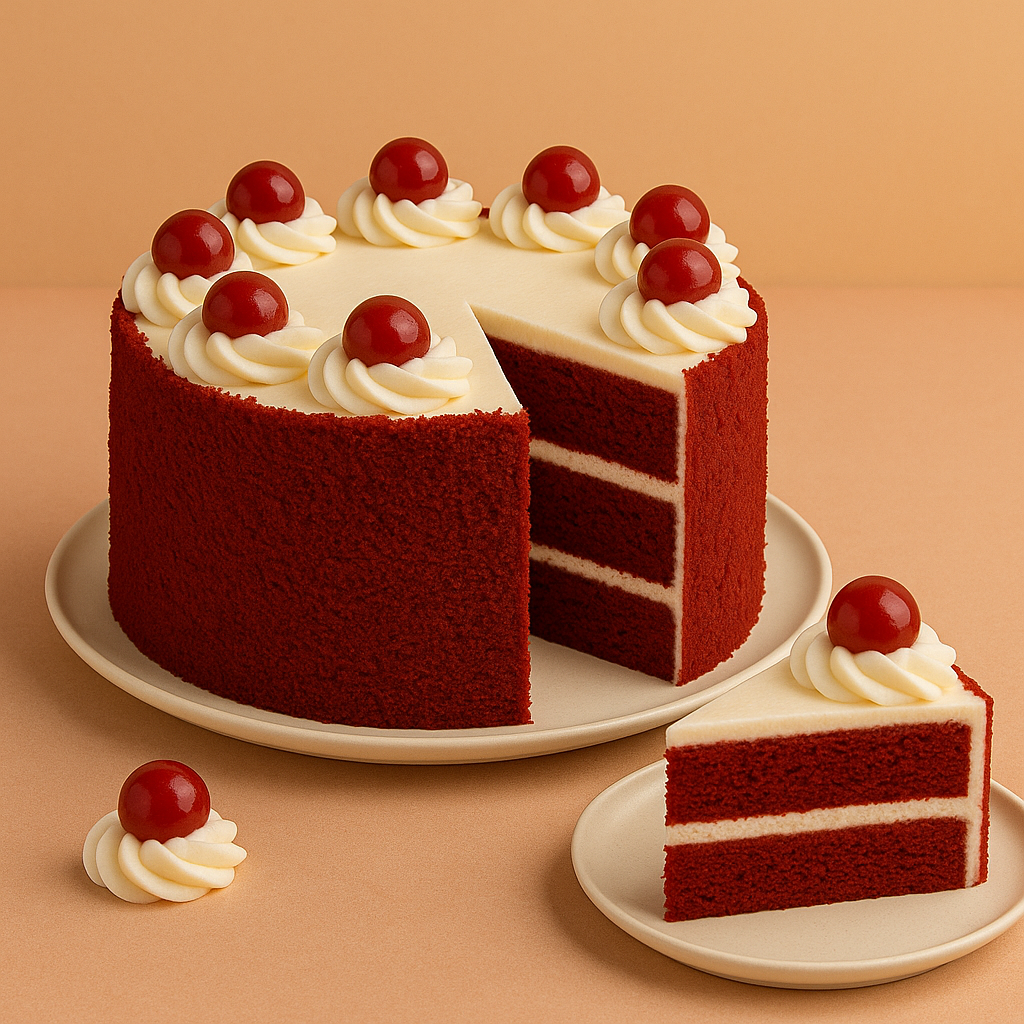 A velvety smooth delight topped with creamy frosting and cherries — a perfect treat for love and luxury.